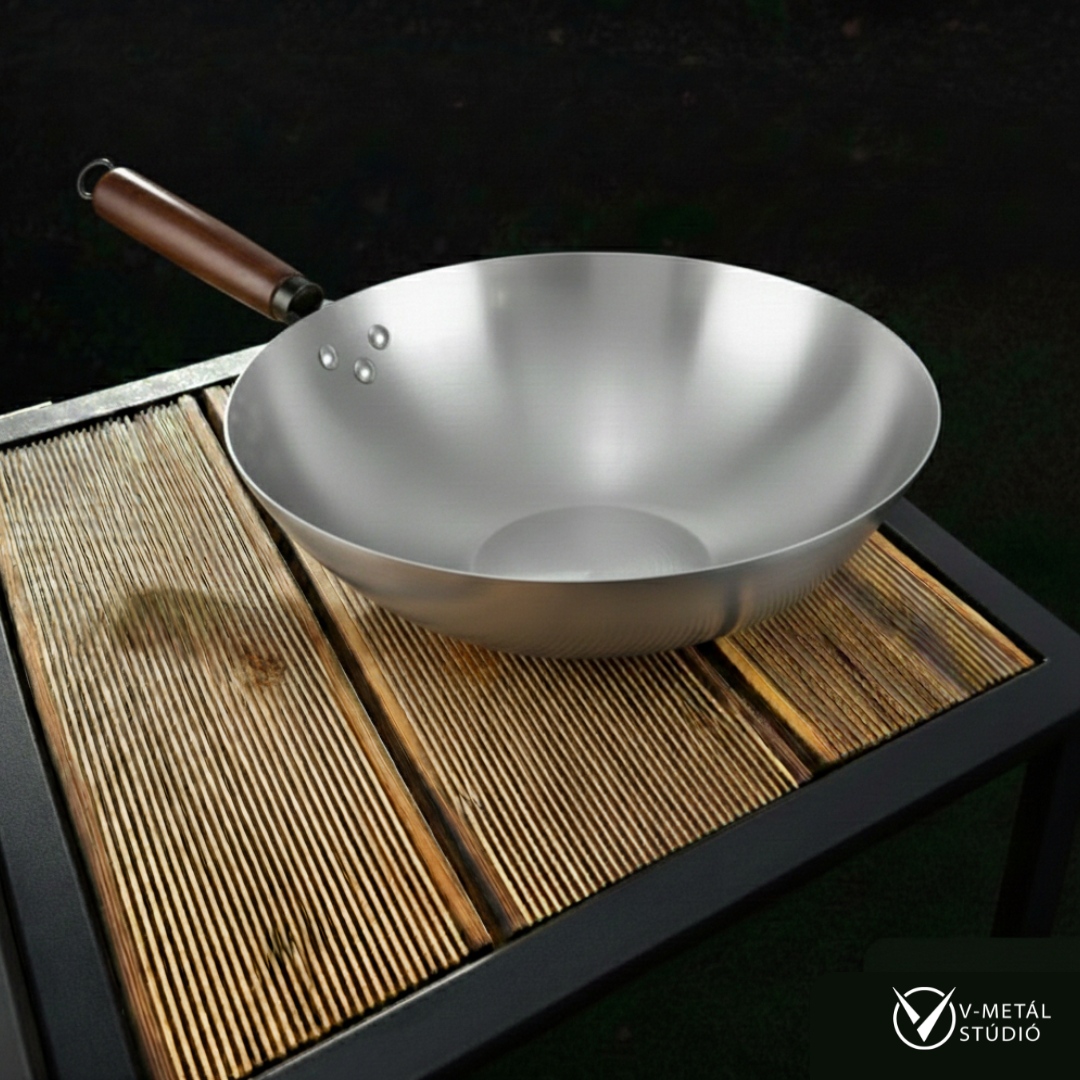 Szénacél wok kiváló hőelosztással, amely ideális nagy hőfokú sütéshez, szabadtéri főzéshez és rakéta tűzhelyen való használatra.